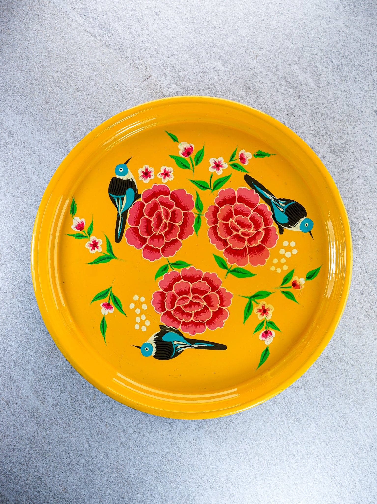 Hand painted, decorative tray from India. Yellow as the sun is this beautiful sheet metal tray that has been hand painted with lead-free paint that is also food safe. Nice tray to set up for juice parties or to make a drink tray for your guests. The tray is decorative, beautifully painted with flowers and birds in many colors. The washer is available at Tools by Landqvist. Stylish, cool tray in bright colours.