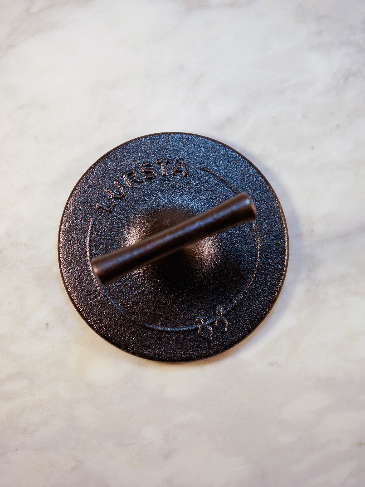 Burgarpress i gjutjärn från Lursta. Gjuten i ett stycke av återvunnet skrot. 14 cm i diameter. Diska i hett vatten och torka av så att den inte rostar.