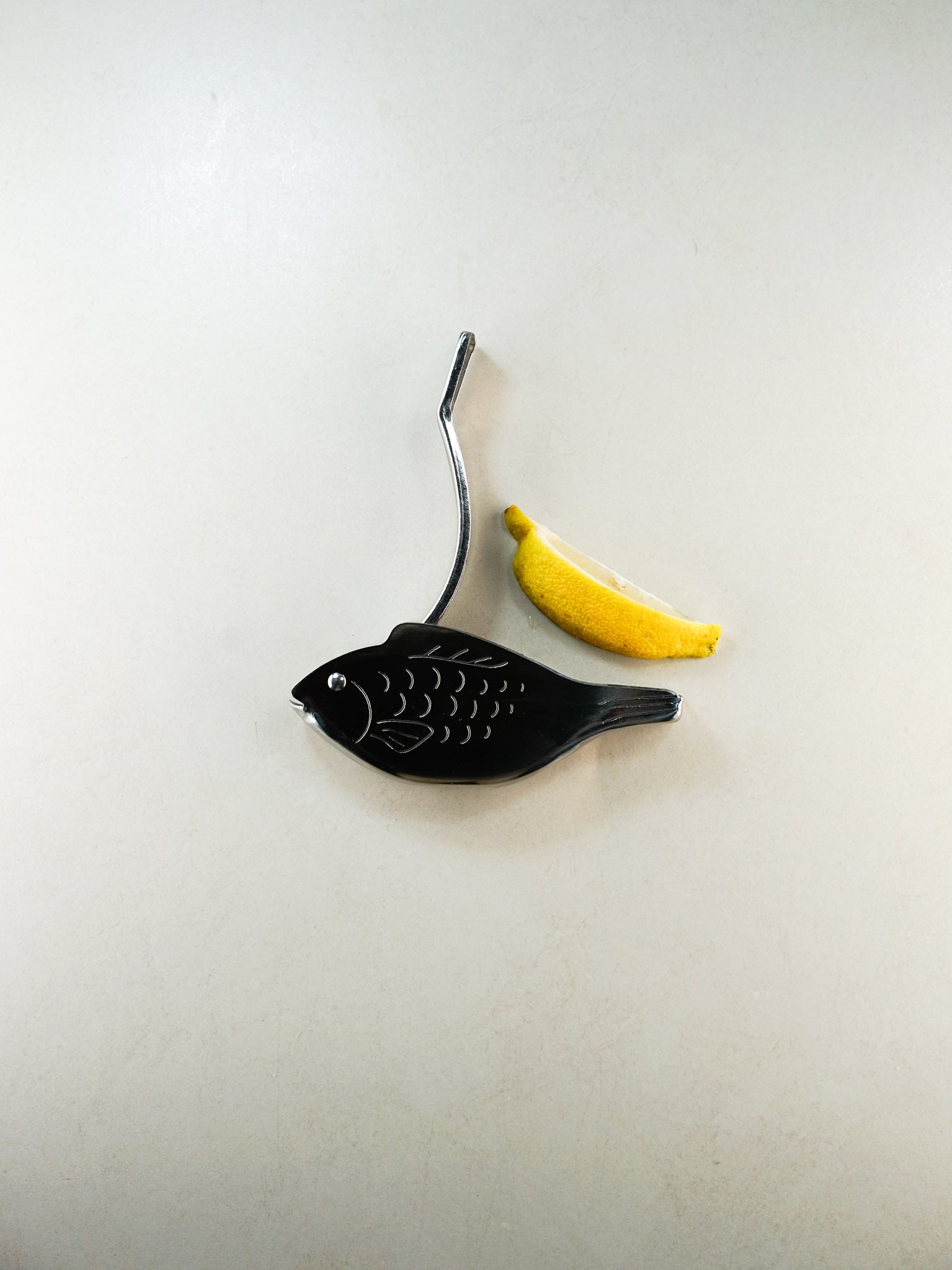 A cute citrus press in the shape of a fish. Stainless steel lemon squeezer that easily squeezes your lemon wedge. Lemon squeezer that is easy to use and a perfect gift maybe you want everyone to have their own citrus squeezer on their plate. Citrus press from Tools by Landqvist.