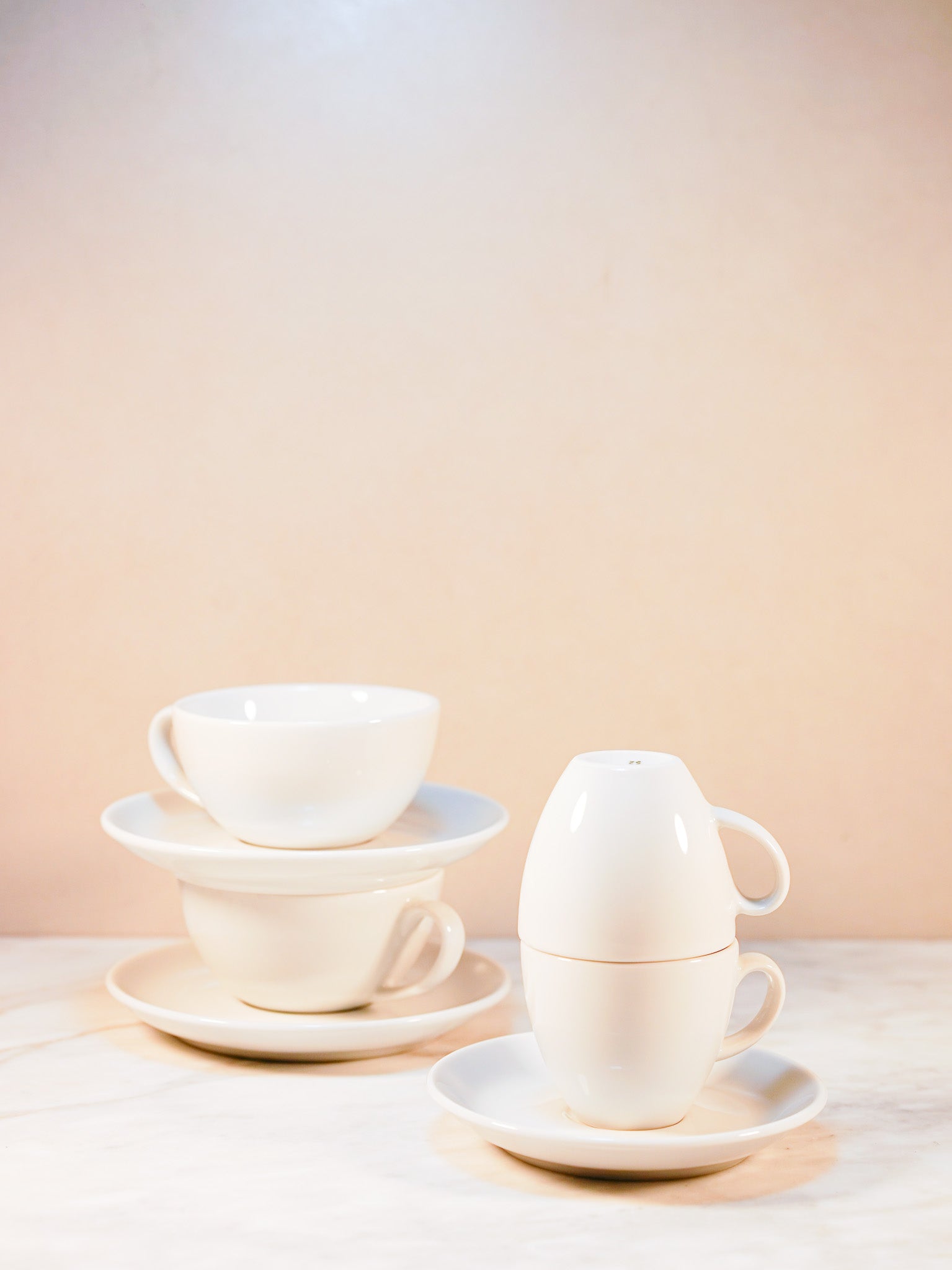 En vit, klassiskt ren espressokopp. Lagom liten för både enkel och dubbel espresso, samt för en macchiato.