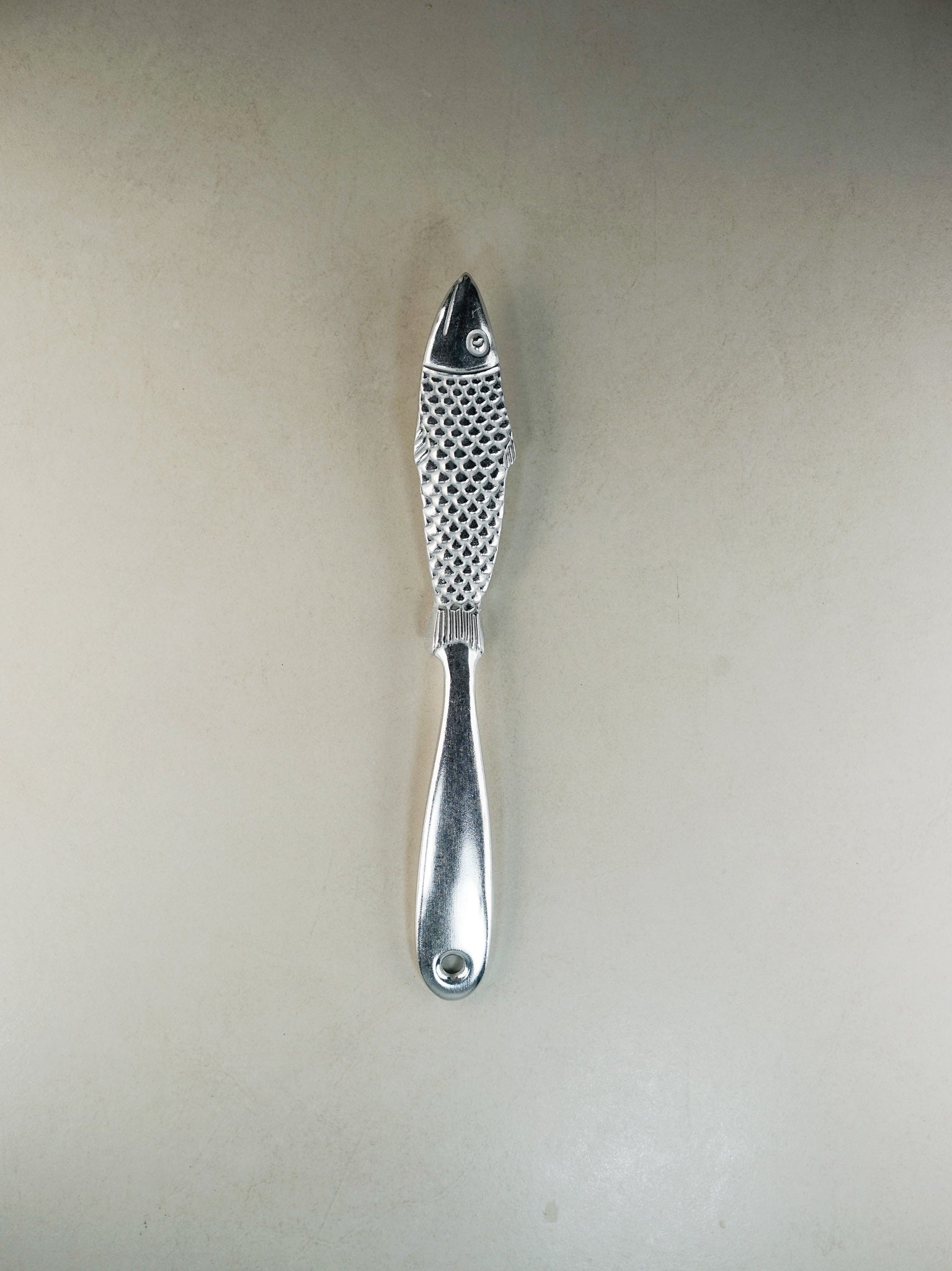 A light aluminum fish scale. Fish scales in the shape of a fish. Scale the fish with a fish scaler. A light and fun fish scale that has the shape of a fish. In the shape of a fish, you easily scale your fish with this aluminum fish scaler. Pull the scales on the fish and they release the scales to be removed. Grilled fish with the skin on is easily scaled with this fish scaler.