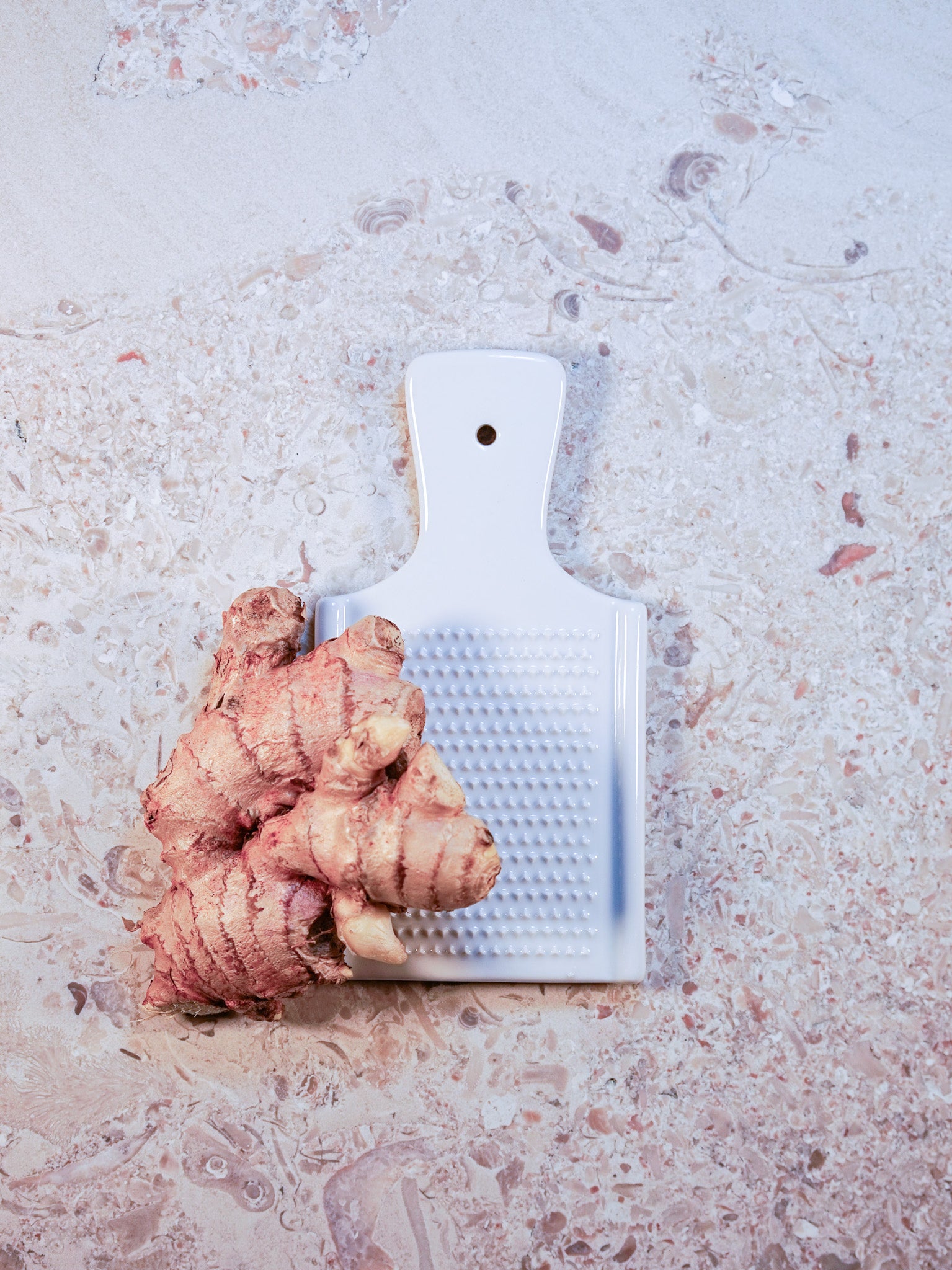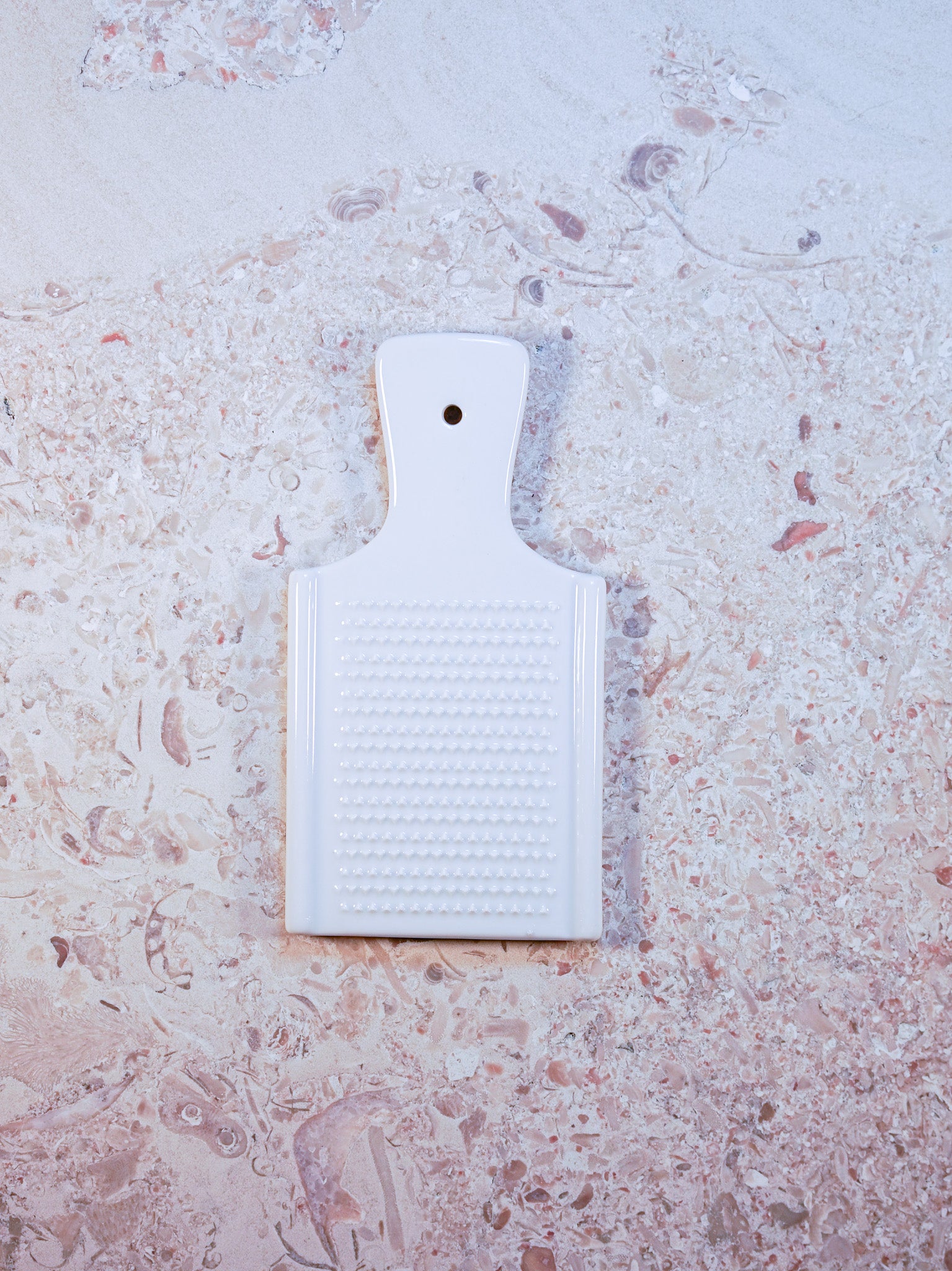 En liten rivare i porslin för ingefära, vitlök och gurkmeja. Antingen kan man ställa fram den på bordet för var och en att riva t ex ingefära direkt i sin ramen, eller så använder man den till matlaningen.
