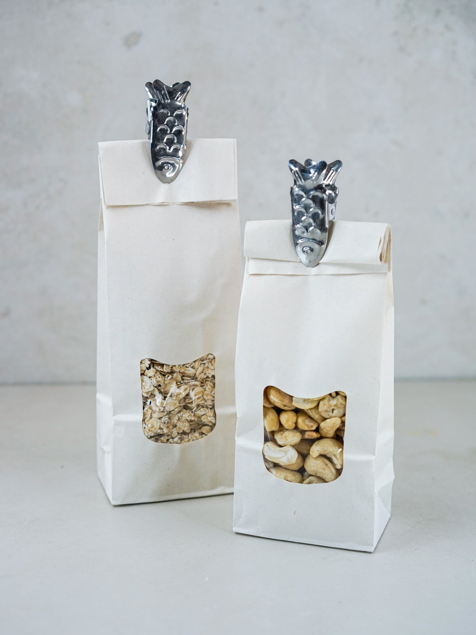 Handmade clips in metal to seal bags with or to have as decoration. The metal clamps are nice to set the table with. Fish clip can be attached around chopsticks or putting a name tag with a clip in the shape of a fish on each napkin. For parties, it can be fun to have something a little more than candy in the bags, and then the fun steel clips can easily be used instead of tape or string. Metal clips that are made of steel where the clips are shaped into a fish. Good clips for bags, envelopes and other things. Clothespins in the shape of a fish that pinch together well. Fish clips bag closure in metal.