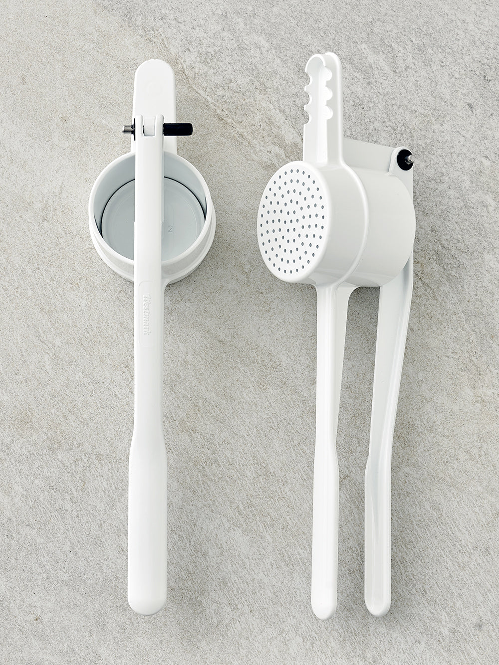 potato press from Westmark that is soft and flexible. The potato press is great for squeezing potatoes with, nice white press and with a five-year warranty! Dishwasher safe potato press is a good thing in the kitchen. Kitchen tools that can be used to make fruit puree or spätzle too. Press potatoes with the westmark potato press and then make homemade gnocchi.
