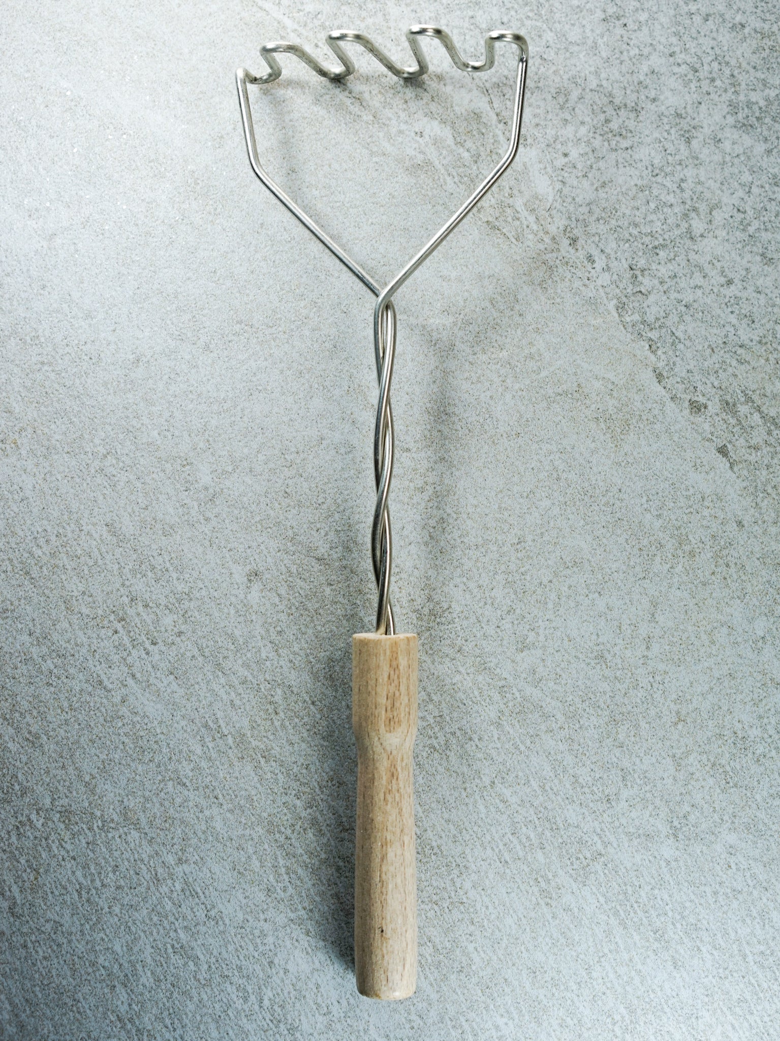 A simple and flexible potato pusher in stainless steel and wood. Beech wood potato masher for mashed potatoes, root mash, potato mash. Mash mash with mashed potatoes. Mash potatoes and other root vegetables with potato masher made of beech wood and stainless steel.
