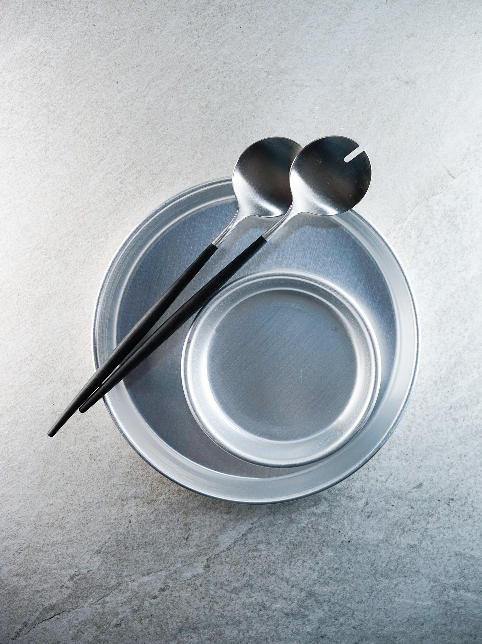 A round aluminum tray in three different sizes. Really nice to serve nuts and chips out of, but in Italy they are used to bake focaccia in and to roast vegetables in the oven. Aluminum tray to have on the table. Decorative, clean, round aluminum tray.