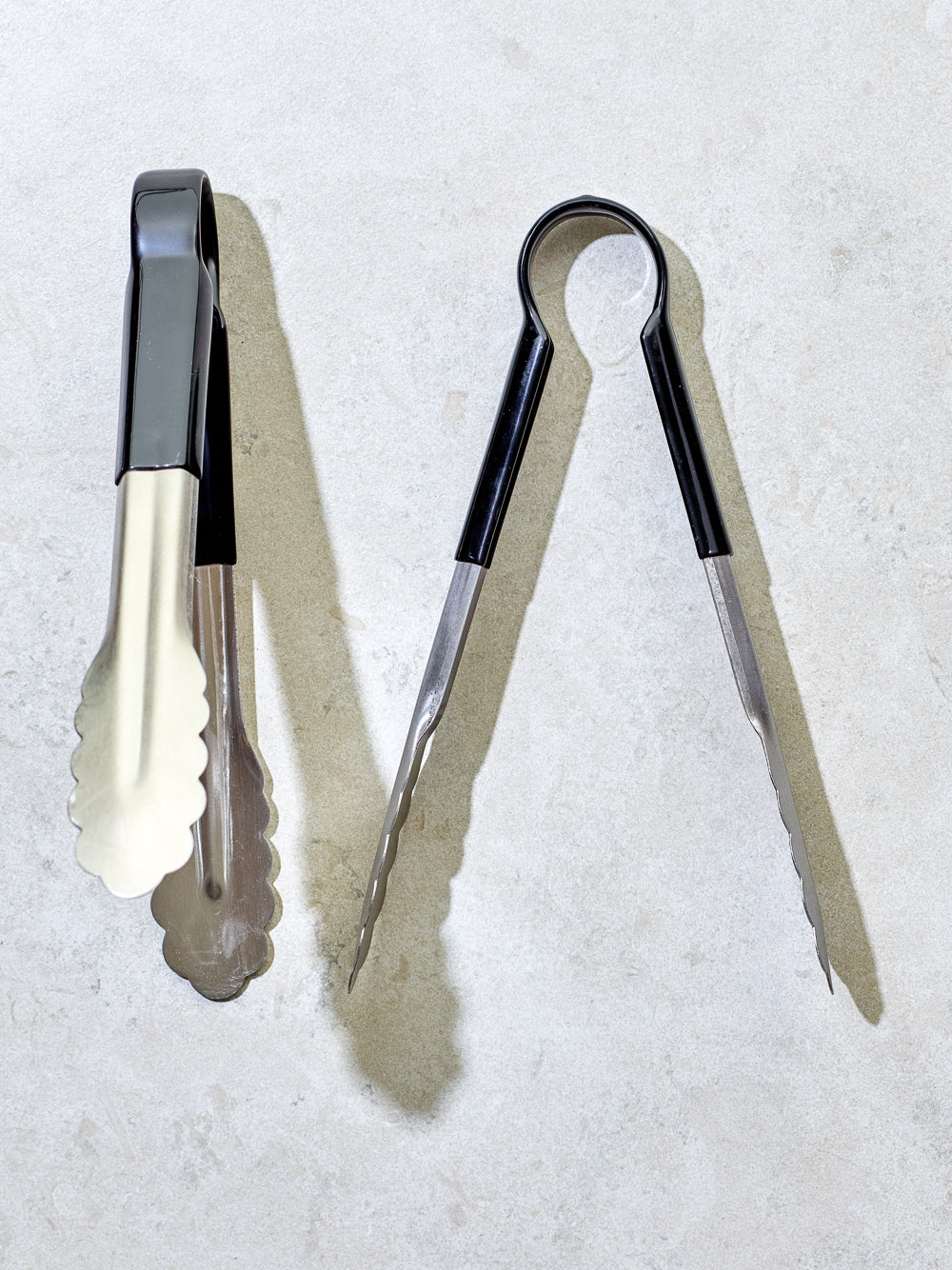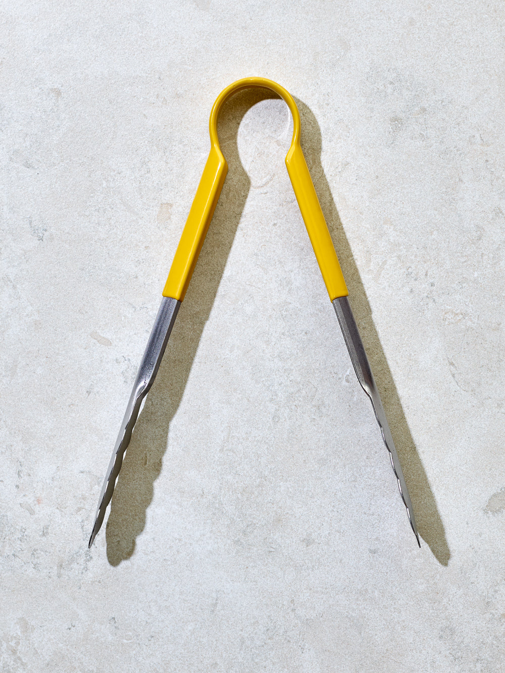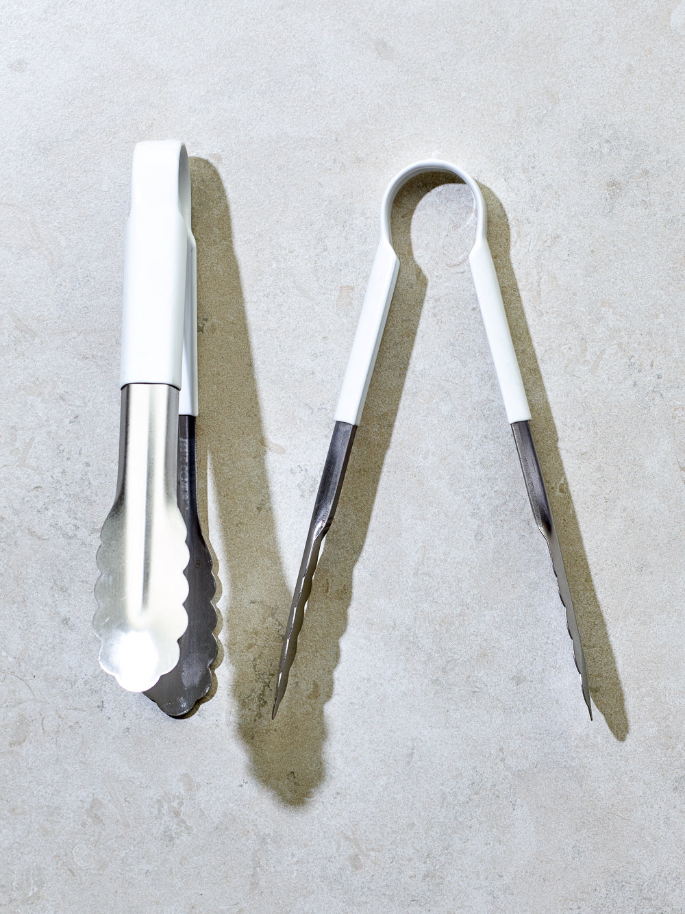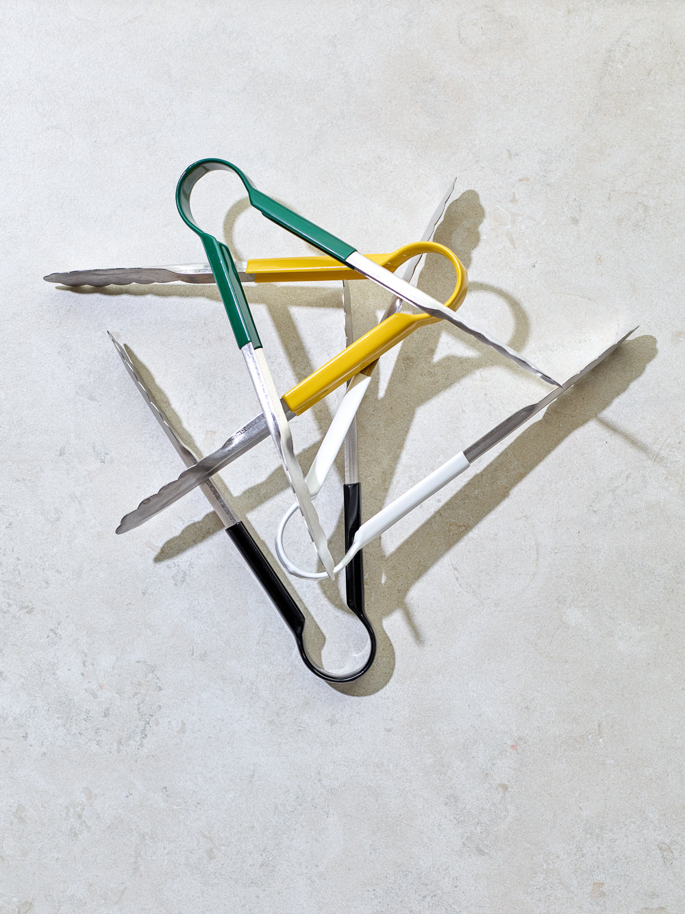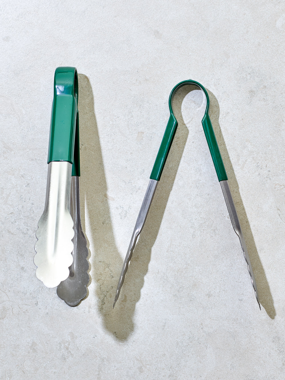 Salad bar in different, nice colors. Stainless steel tongs suitable for taking cakes or salads. Tongs that can be used for many things in the kitchen. Different colors can have different uses.