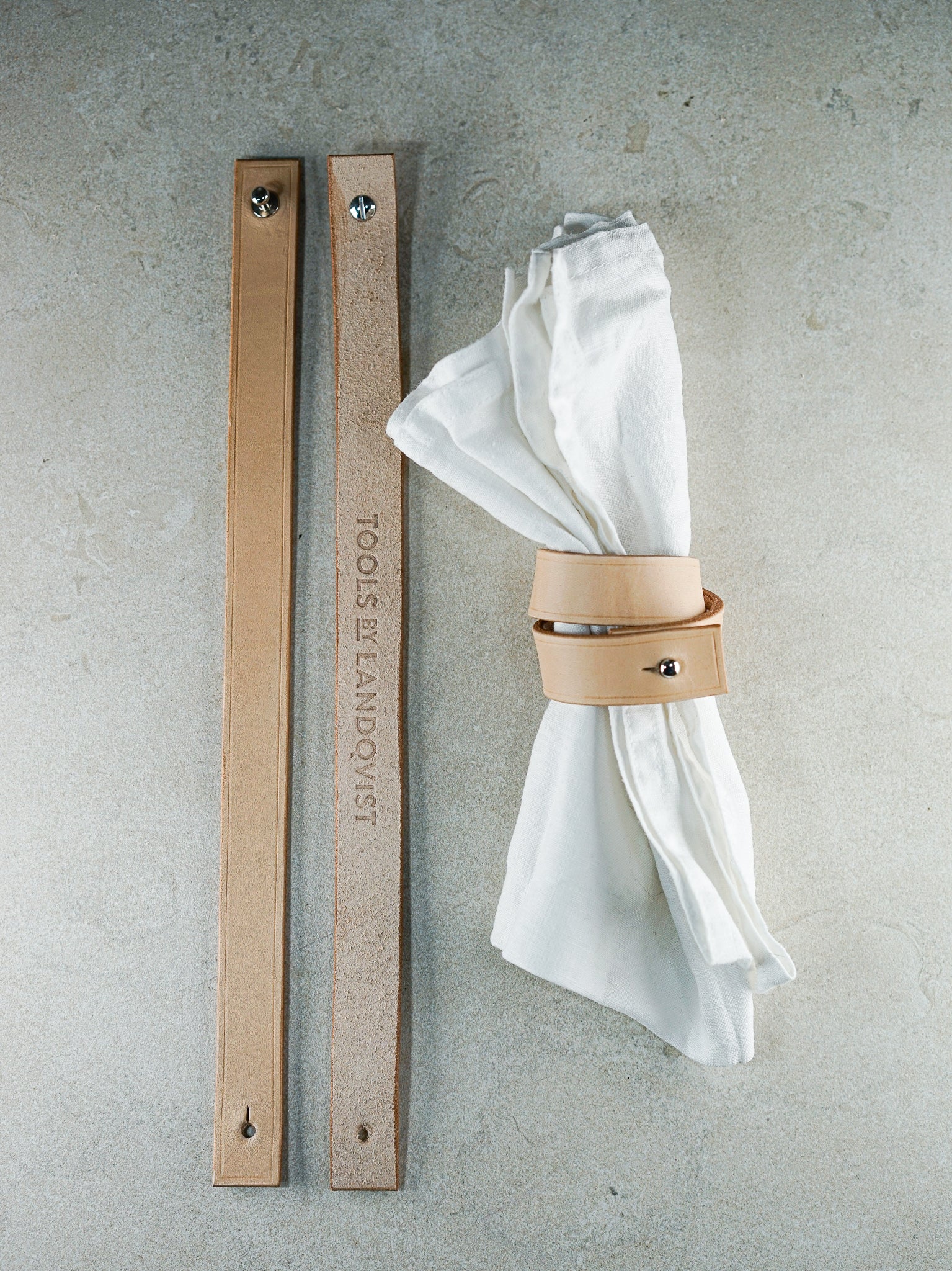 Jag tycker att det är fint att kalla servettringar för servettomslutare då det är just det de ska fungera som, att omsluta servetten på ett vackert vis. Servettomslutarna kommer i par om 2 stycken i varje ask. Naturskinnet kommer att mörkna vackert med tiden. Finns även i svart skinn och ingår i serien Ängby som är framtagen av Tools By Landqvist i nära samarbete med Stina Atelier som har verkstad i Södra Ängby i Stockholm.