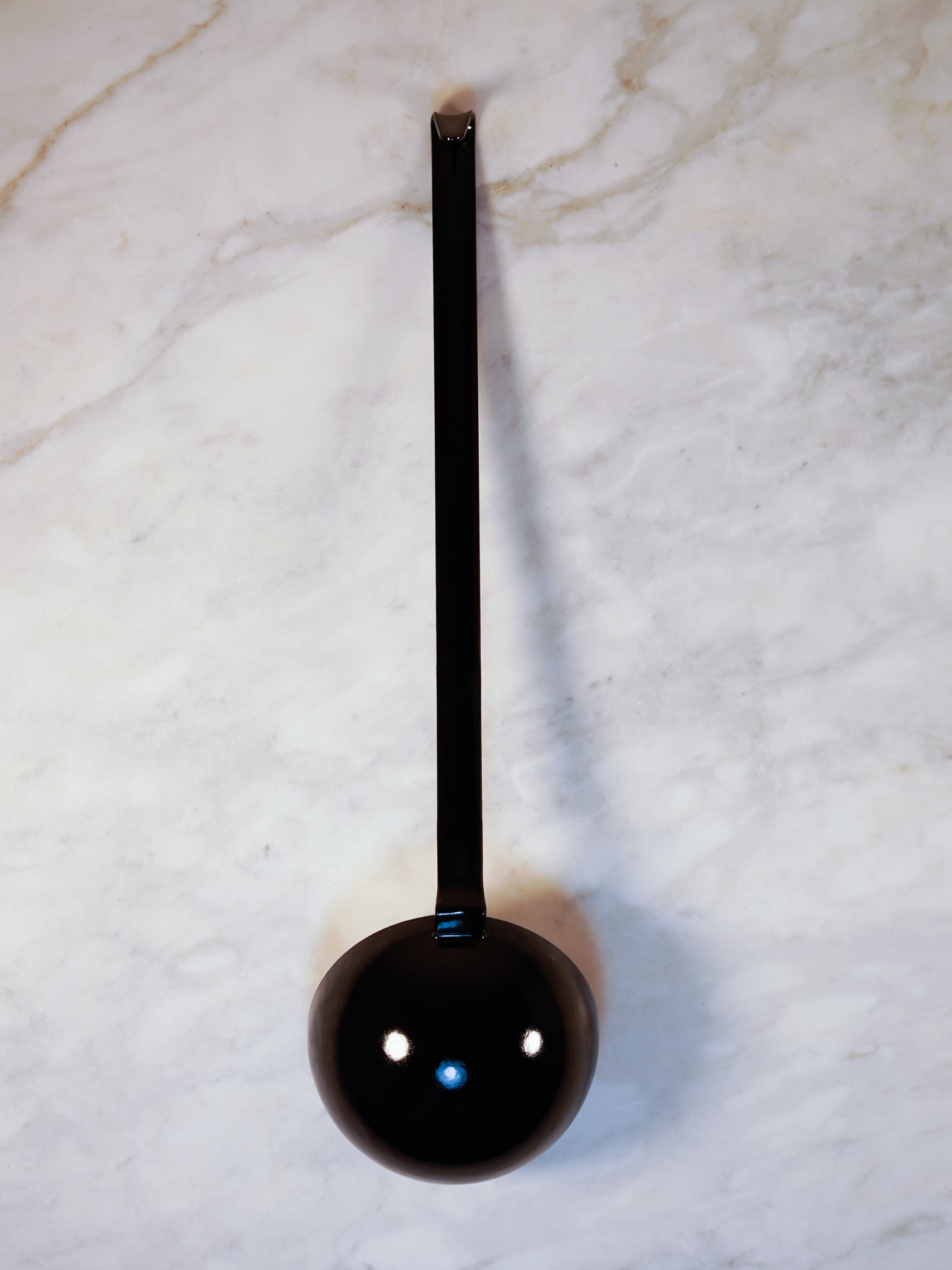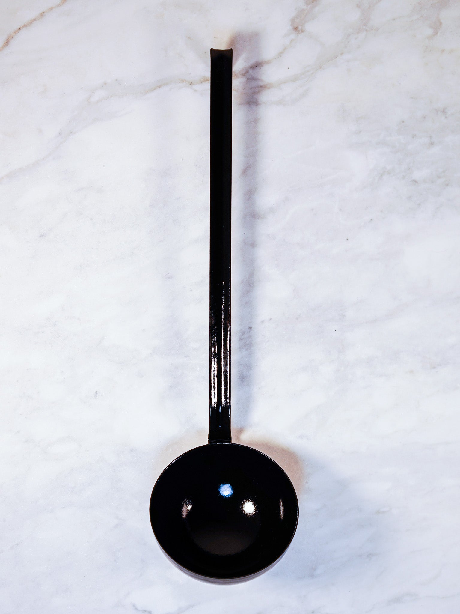 Soppsleven är lika fin i en rostfri kastrull som till de andra svarta emaljprodukterna.