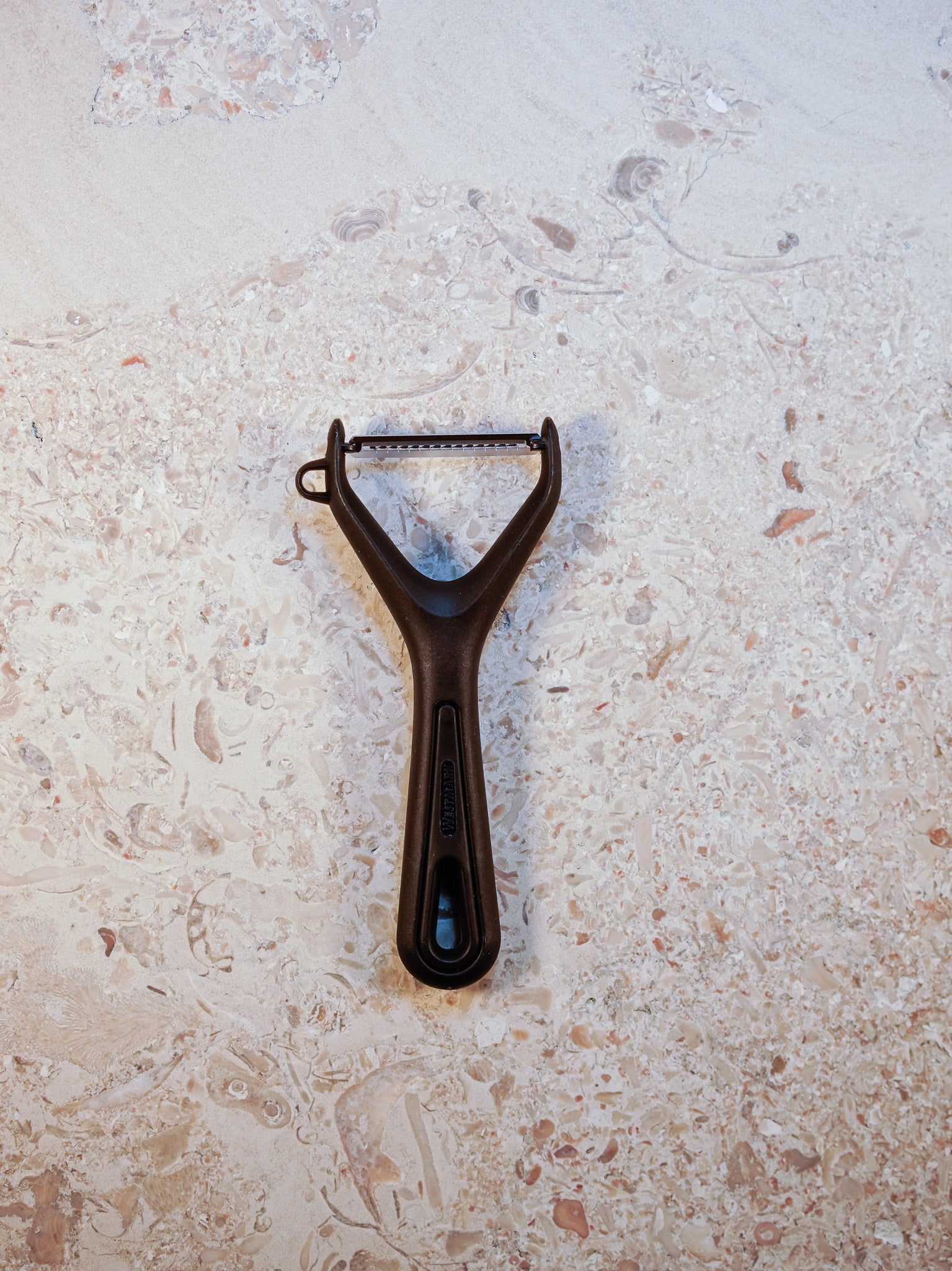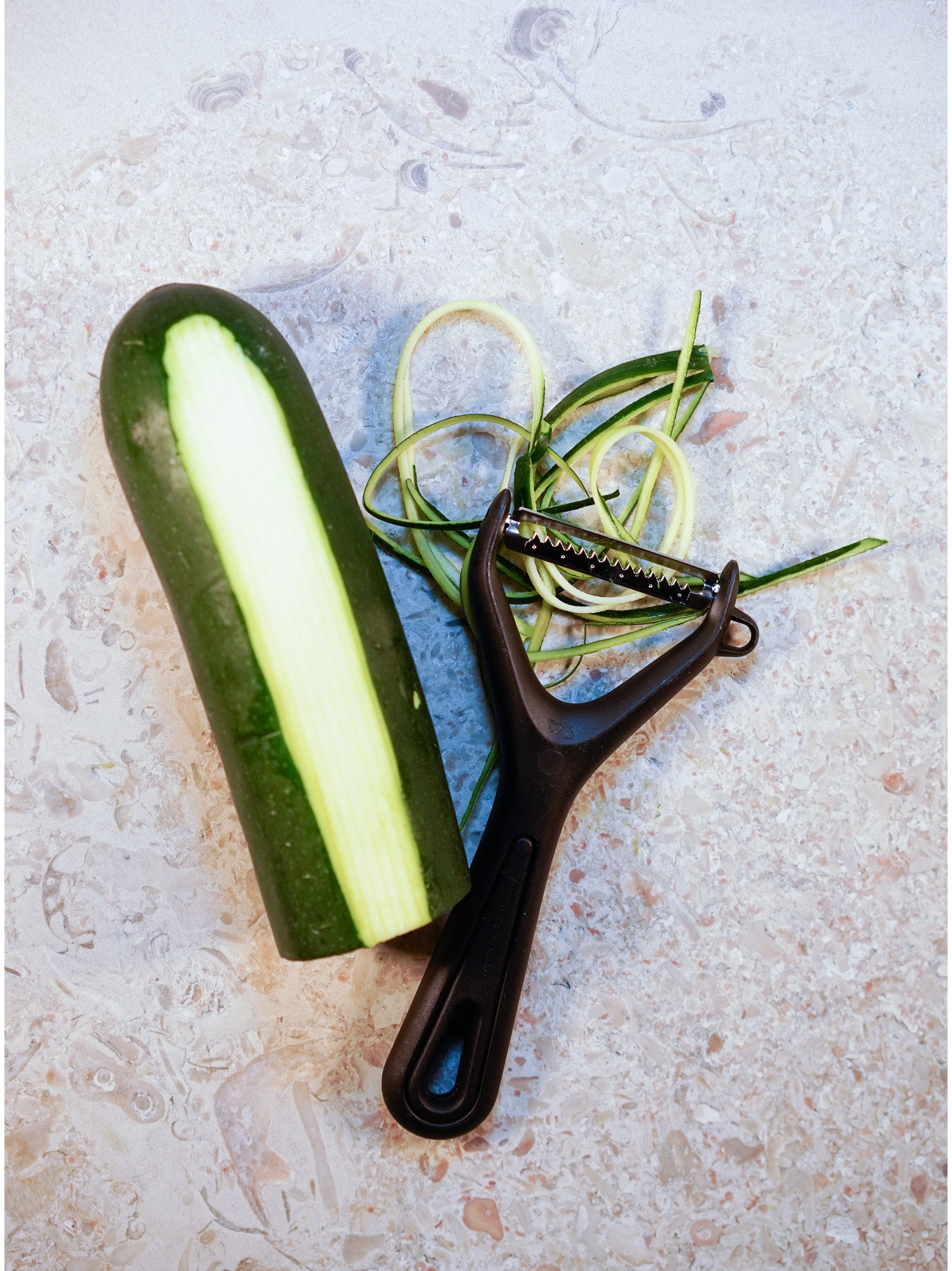 Det är precis vad det låter som. En liten mojäng som strimlar grönsaker. Dra den längs zucchinin, gurkan, moroten eller kålen så får man långa remsor. Det blir inte som lång grönsaksspaghetti men fint att strimla ner direkt i salladen eller att fräsa snabbt i olivolja och vitlök i en panna.