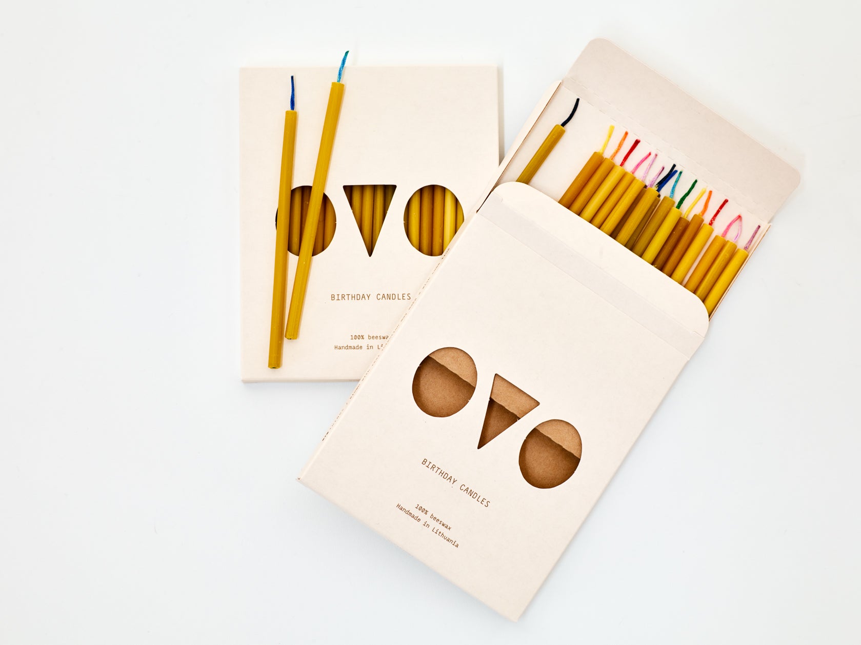 Beeswax cake candles with colored wicks are natural for the environment. Candle from ovo with colored wicks. Cake candles are nice in birthday cake. The cake candles smell good and have different colors on the wicks. A beautiful cake is made with ovo cake candles. Eco-friendly non-toxic candles by beekeepers.