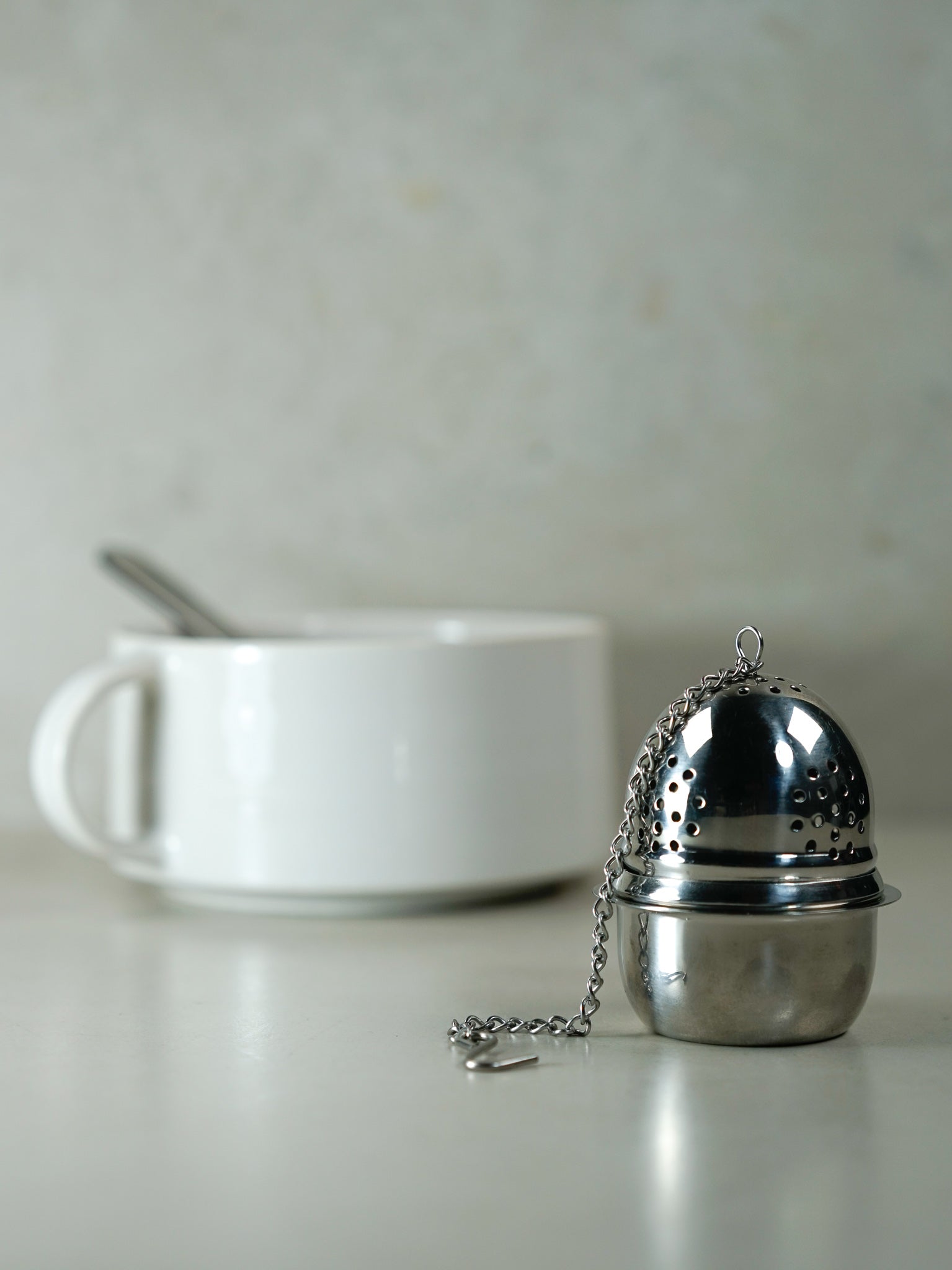 Tea ball in stainless steel with a smart little cup to place the tea ball in so that it can drip from there. Tea balls are good for your tea when making a cup of tea. The stainless steel tea balls are easy to run in the dishwasher and can hang on their little hook. Smart tea ball that has a cup it can stand in.