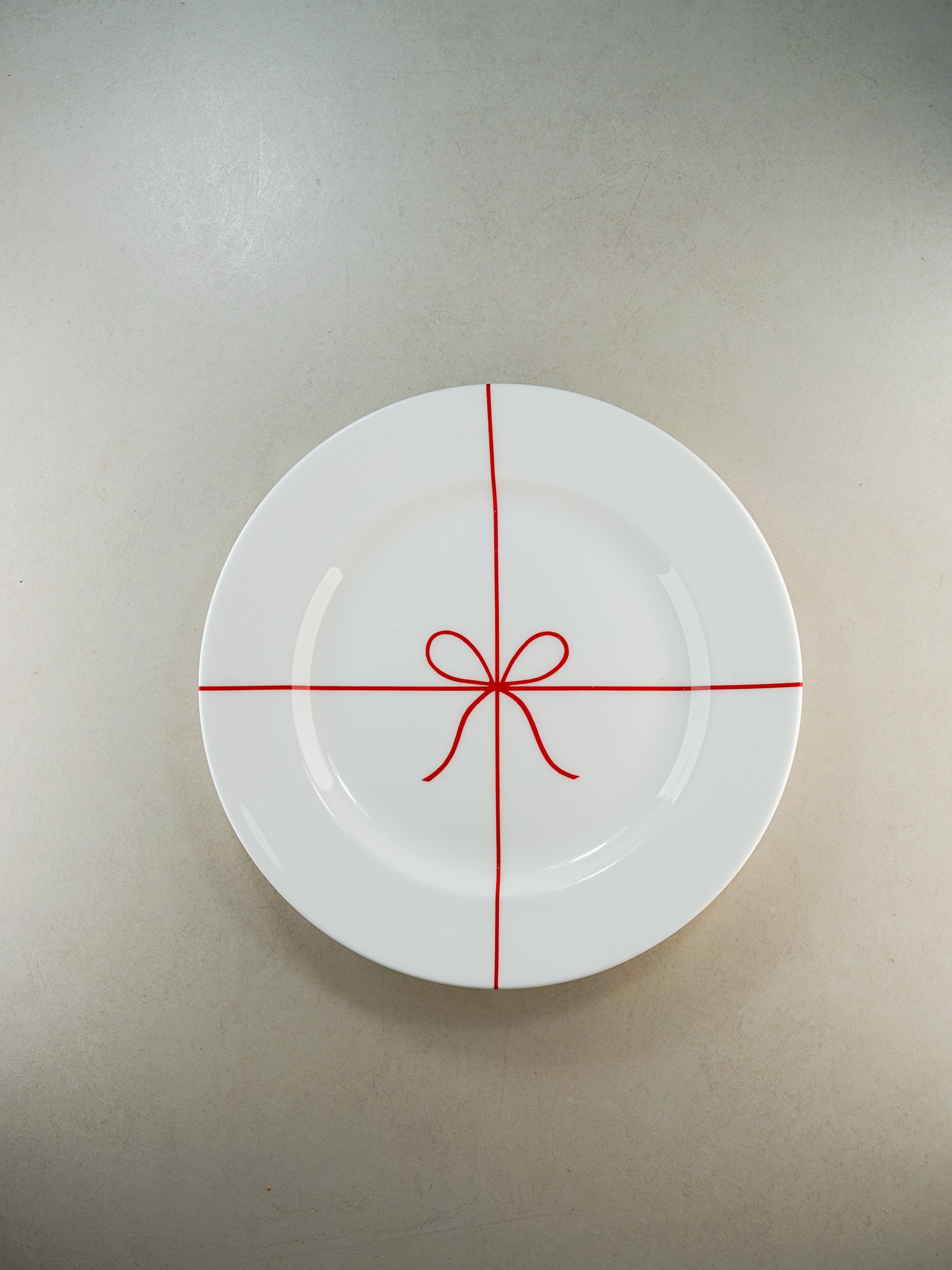 Fakta: Mattallrik 24 cm i diameter. Dekor julsnöre i rött. Tillverkad i Sverige av benporslin.
