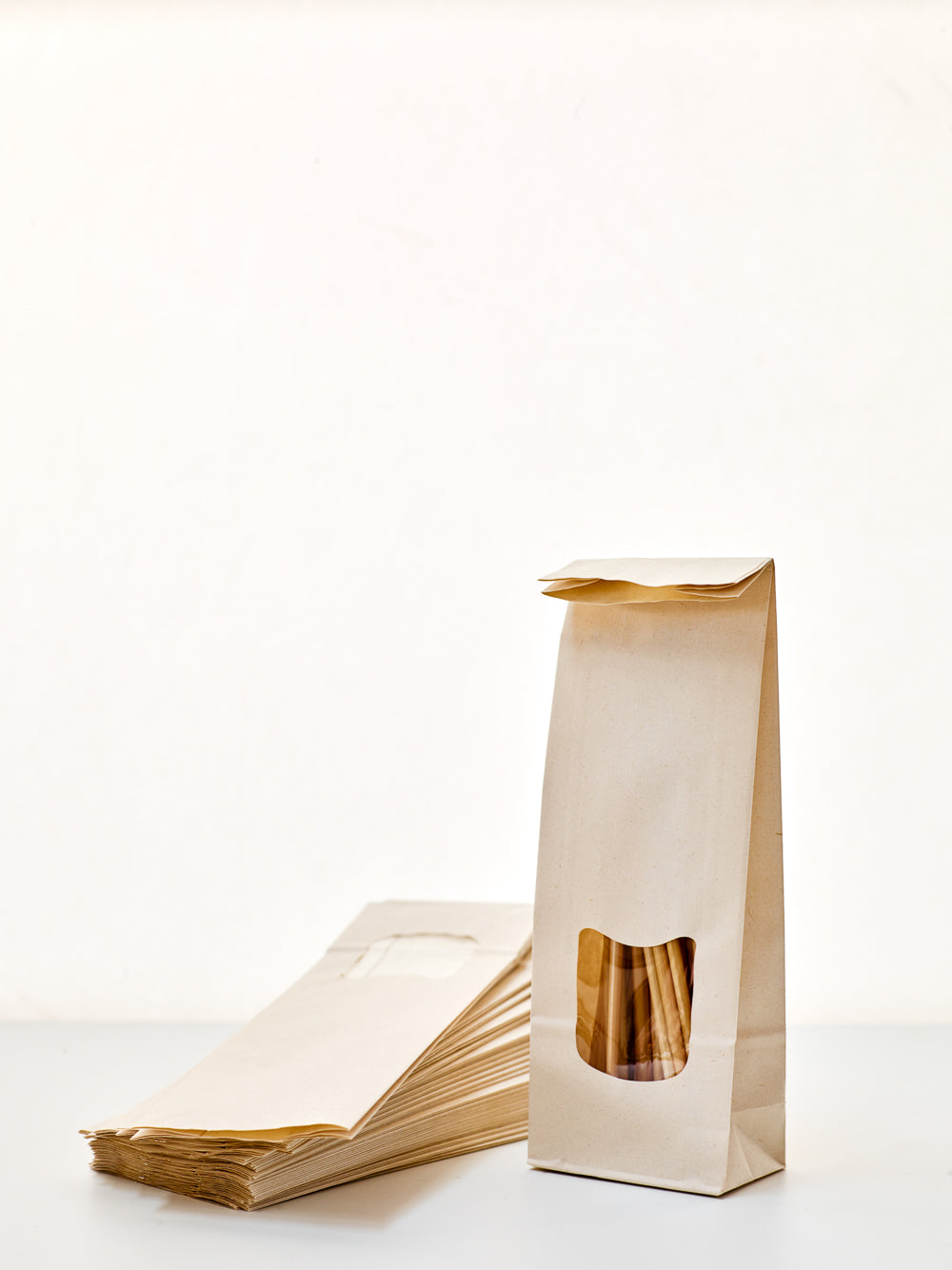 10 stycken förpackningspåsar med fönster som är framställda av restprodukter från lantbruksskördar. Insidan är dessutom laminerad med film från biomaterial så att de inte blir fläckiga om man fyller dem med t ex kakor eller liknande som är lite feta.