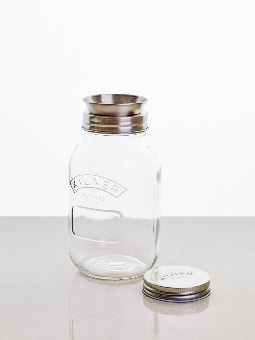 Info: Kraftig glasburk som rymmer 1 liter. H:245 mm B:100 mm. Lock och strimlare i rostfritt stål, båda skruvas enkelt av och på.